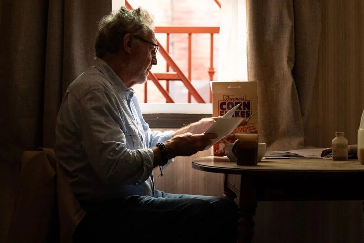 Frank, the morning before he is laid off. He checks his bills and grumbles about the work day ahead of him.